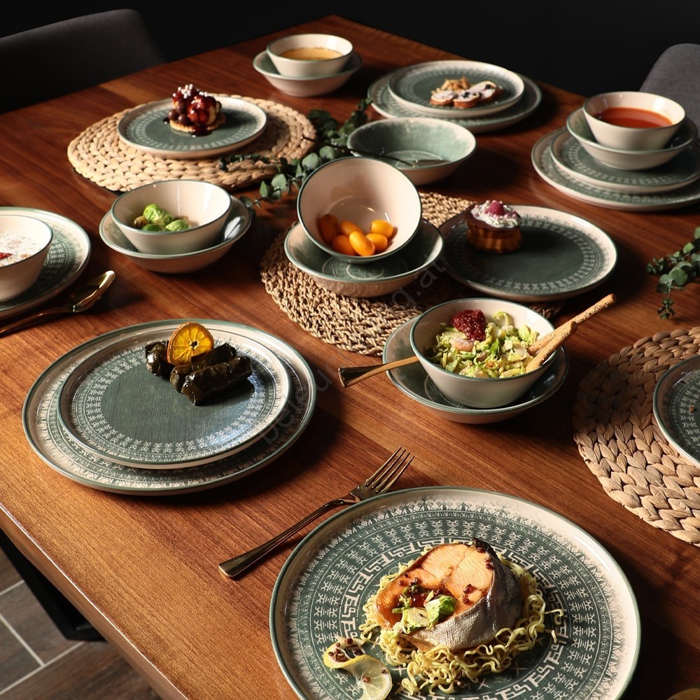 24-teiliges Geschirrset, beige/grün, aus Steinzeug