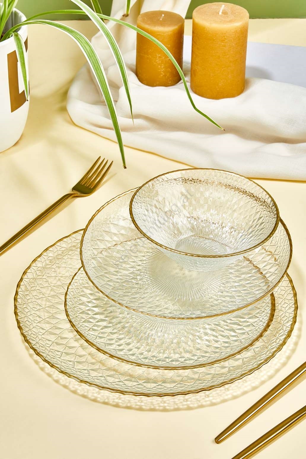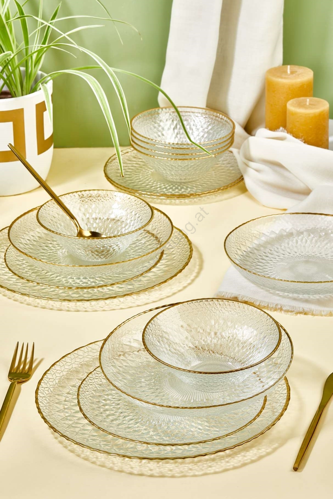 24-teiliges Speiseservice aus Glas, transparent mit goldenen Akzenten