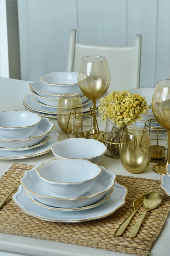 24-teiliges Steingut-Geschirrset in Weiß mit goldenen Akzenten