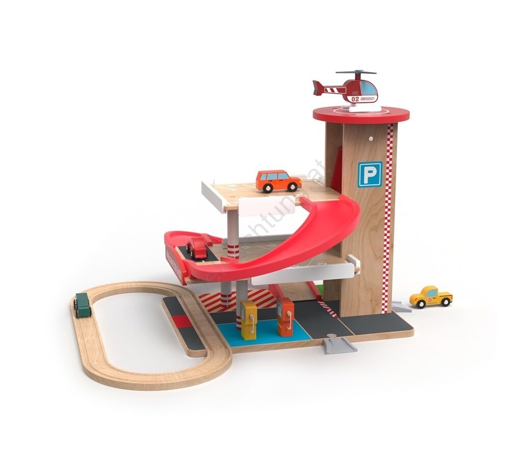 • Lieferumfang: Garage mit Hubschrauberlandeplatz und Aufzug, 3 Parkflächen, 4 Autos, 2 Zapfsäulen für Kraftstoff, 1 Elektrozapfsäule, 1 Hubschrauber, Schienen.