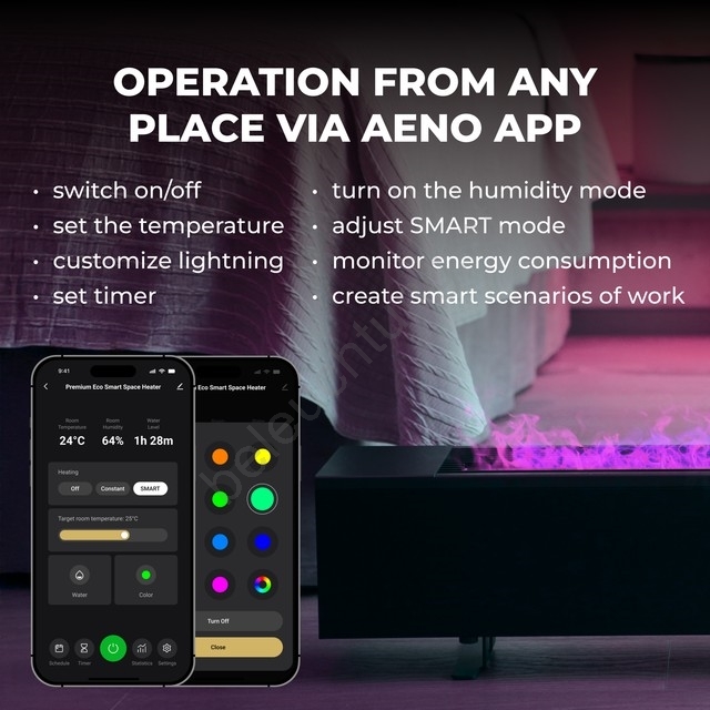 • Das Gerät lässt sich per Smart-App über WLAN steuern; Timer, Heizstufen und Effektfarbe sind einstellbar.