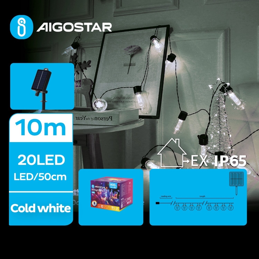 Aigostar - LED-Solar-Lichterkette, 20 LEDs / 8 Funktionen, 11,5 m, 1200 mAh, IP65, kaltweiß