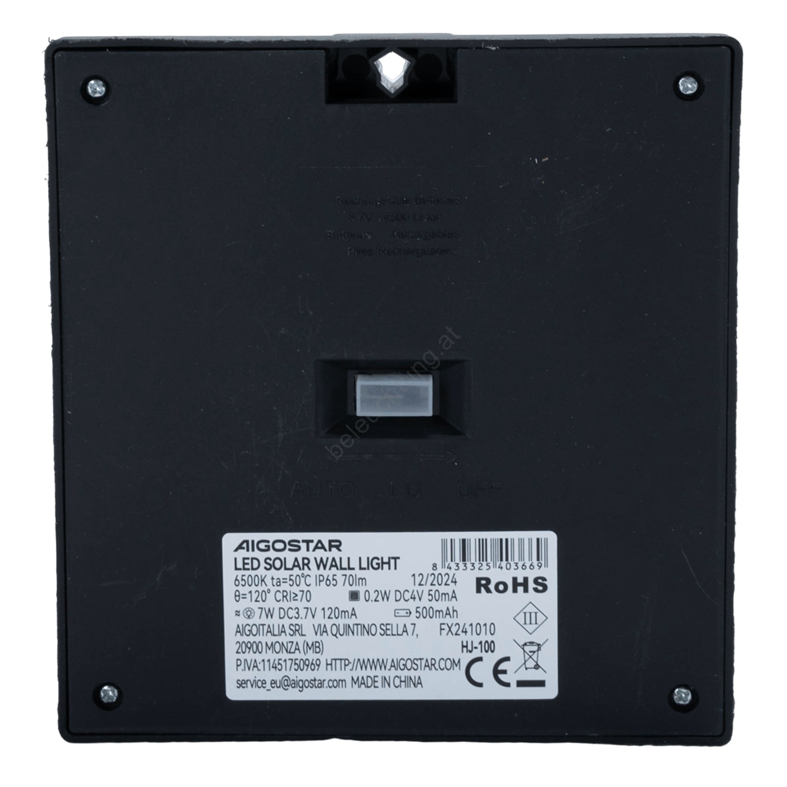 Aigostar - LED-Solarleuchte mit Sensor, 3,7 V, 6500 K, 500 mAh, IP65, schwarz