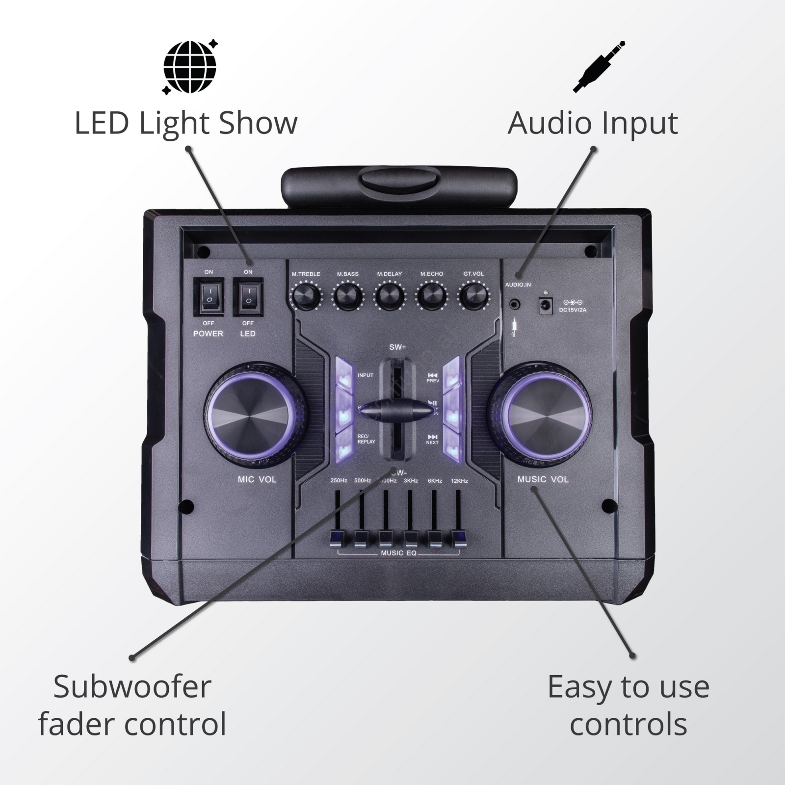 • Der Lautsprecher verfügt über ein LED-/VFD-Display und eine LED-Lichtshow.