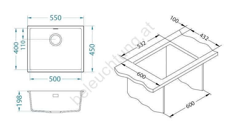 • Lieferumfang: Granitspüle, Befestigungsclips, Siebventil 3 1/2, Siphon mit Anschluss für die Spülmaschine.