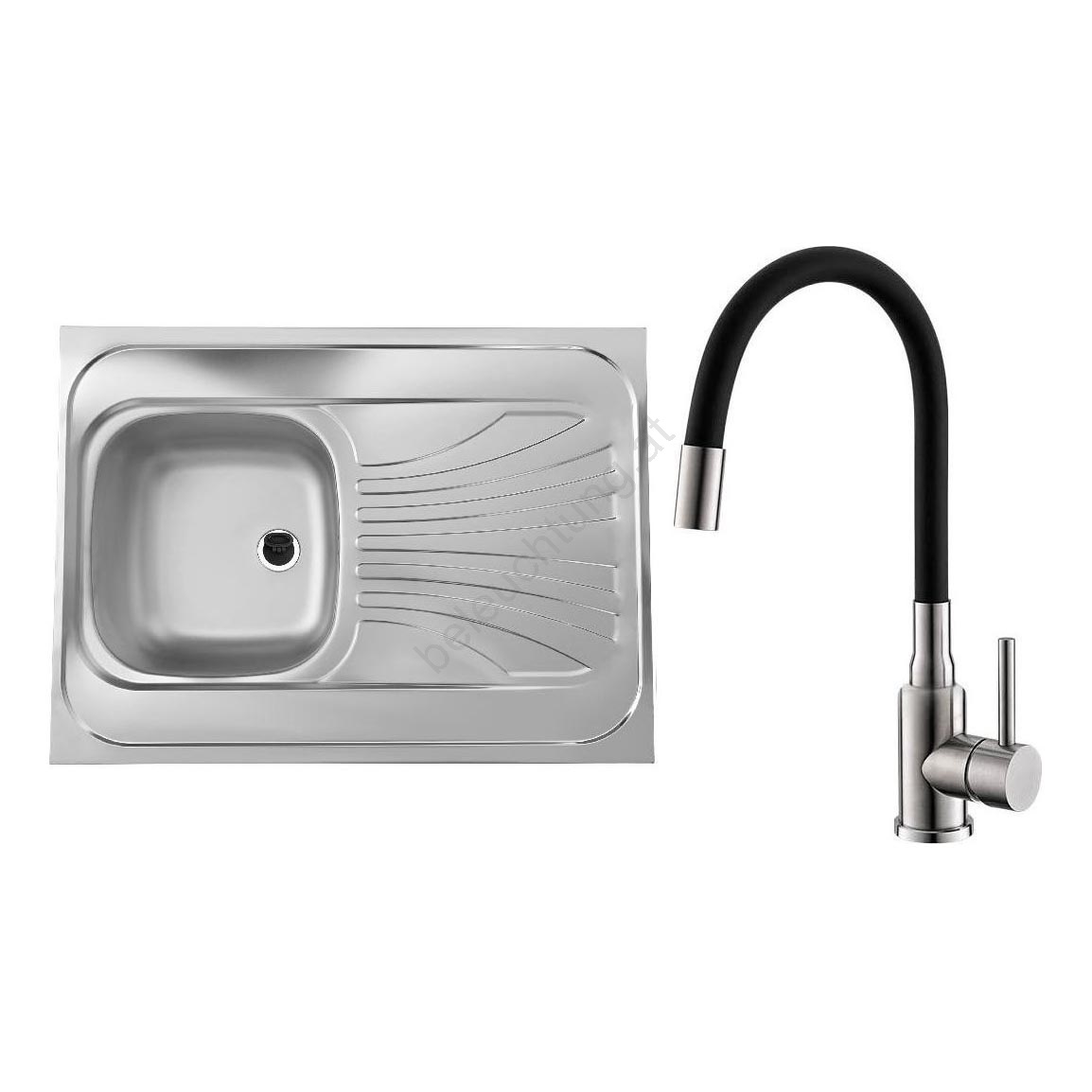 • Obsah balení: Edelstahlspüle, Ablauf 1 1/2, Siphon mit Abzweig für Geschirrspüler, Stöpsel, Küchenarmatur, Anschlussschläuche, Montage-Set.