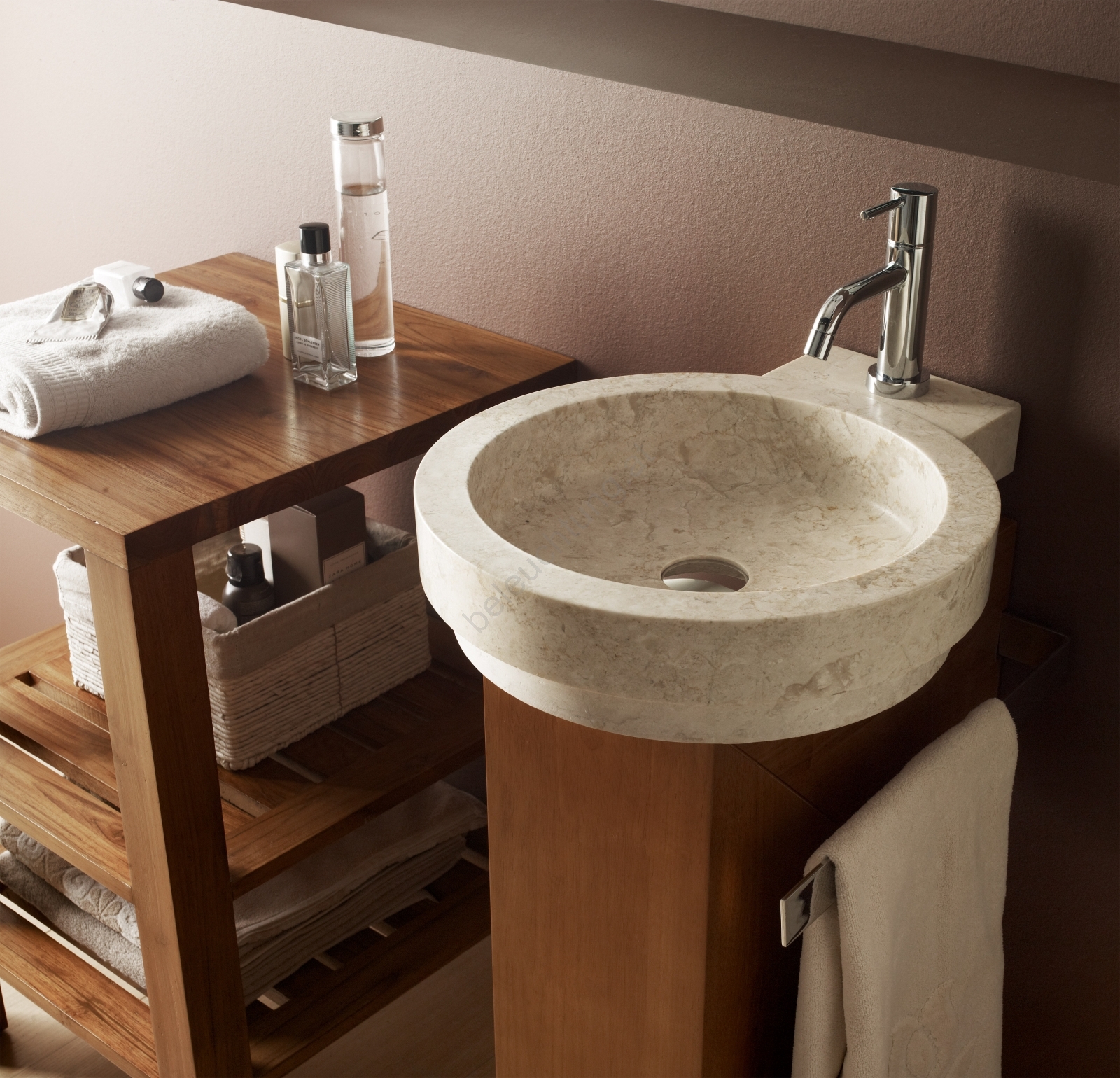• Das Waschbecken ist aus Naturstein gefertigt.