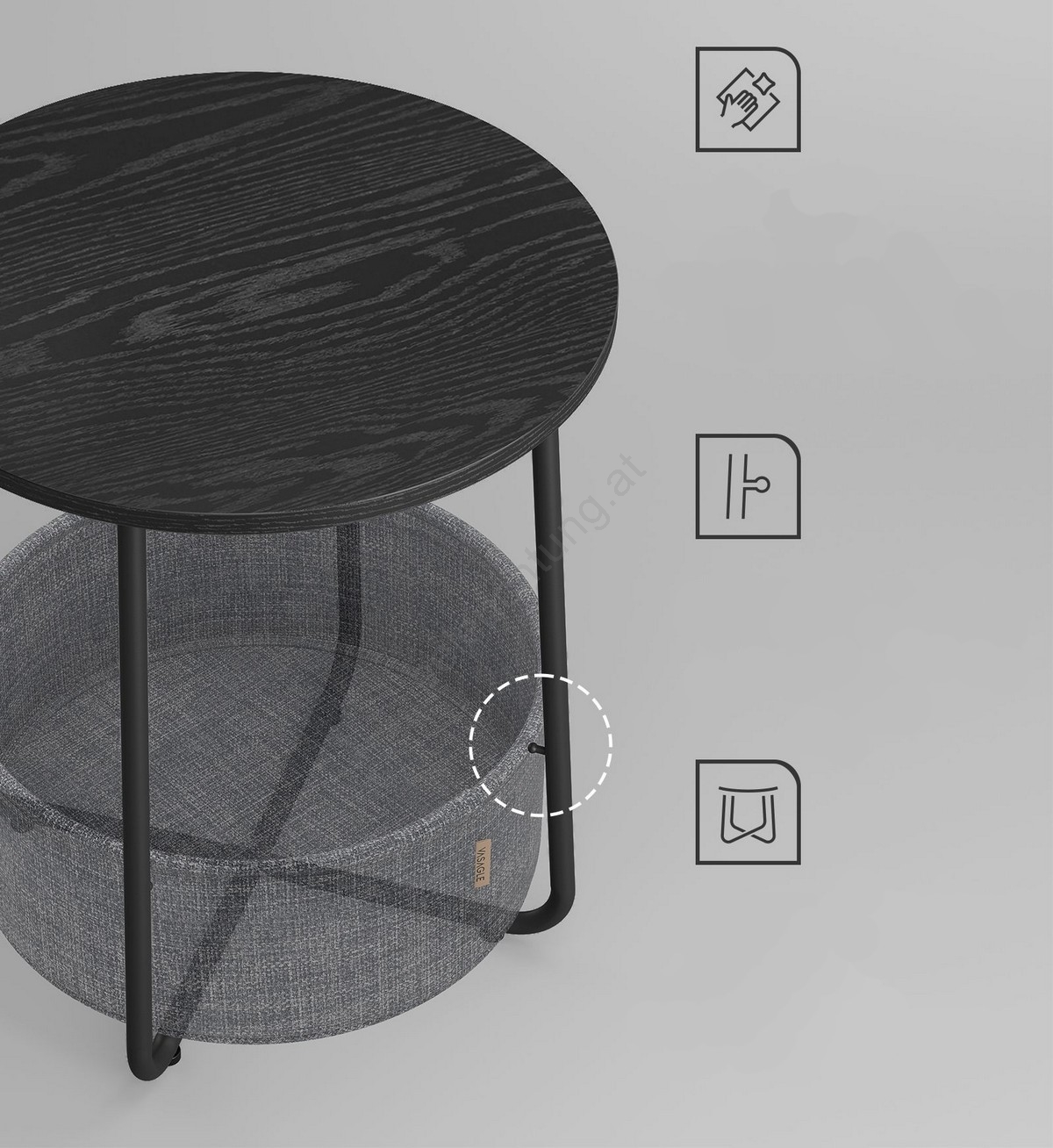 • Er verfügt über einen Stoffkorb im unteren Bereich mit einer Höhe von 18,2 cm und einem Durchmesser von 39,6 cm.