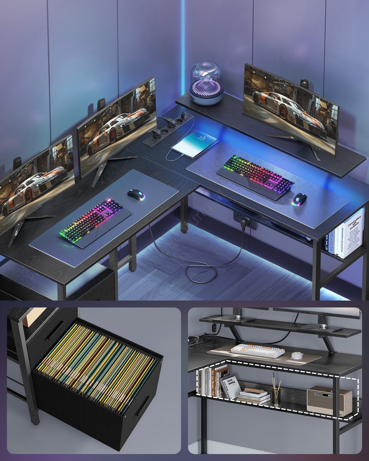 • Die praktische integrierte Tischsteckdosenleiste ist mit 4 Steckdosen und 2 USB-Ports ausgestattet, um mehrere Geräte gleichzeitig anzuschließen.