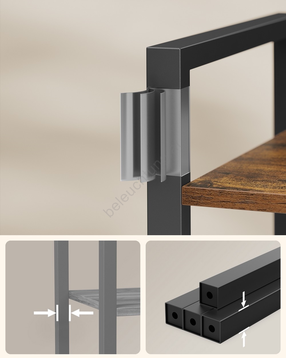 • Das beiliegende Antikipp-Set hilft Ihnen, das Regal zu befestigen, erhöht dadurch seine Stabilität und hält es an der Wand.