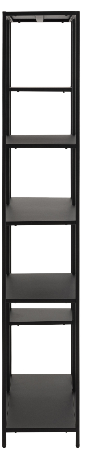 • Gestell, 6 Regalböden und Basis aus matt schwarzem Stahl mit grober Pulverbeschichtung und asymmetrischen Details.