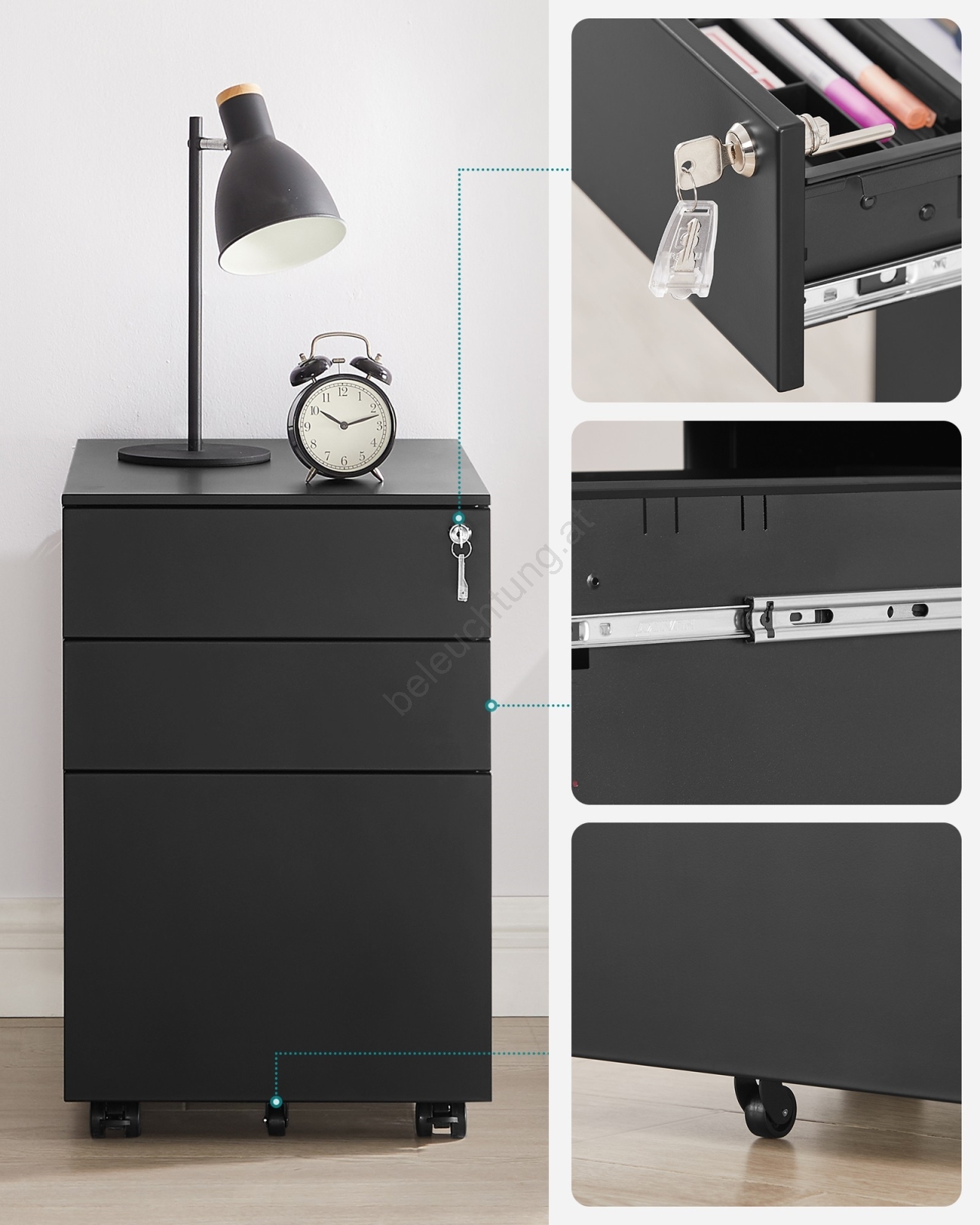 • Die obere Schublade ist abschließbar.