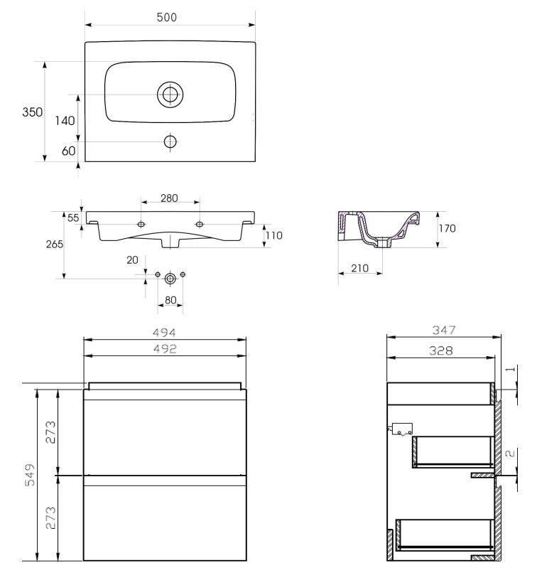 • Das Keramikwaschbecken hat eine klassische rechteckige Form mit Loch für Armatur und Überlauf.