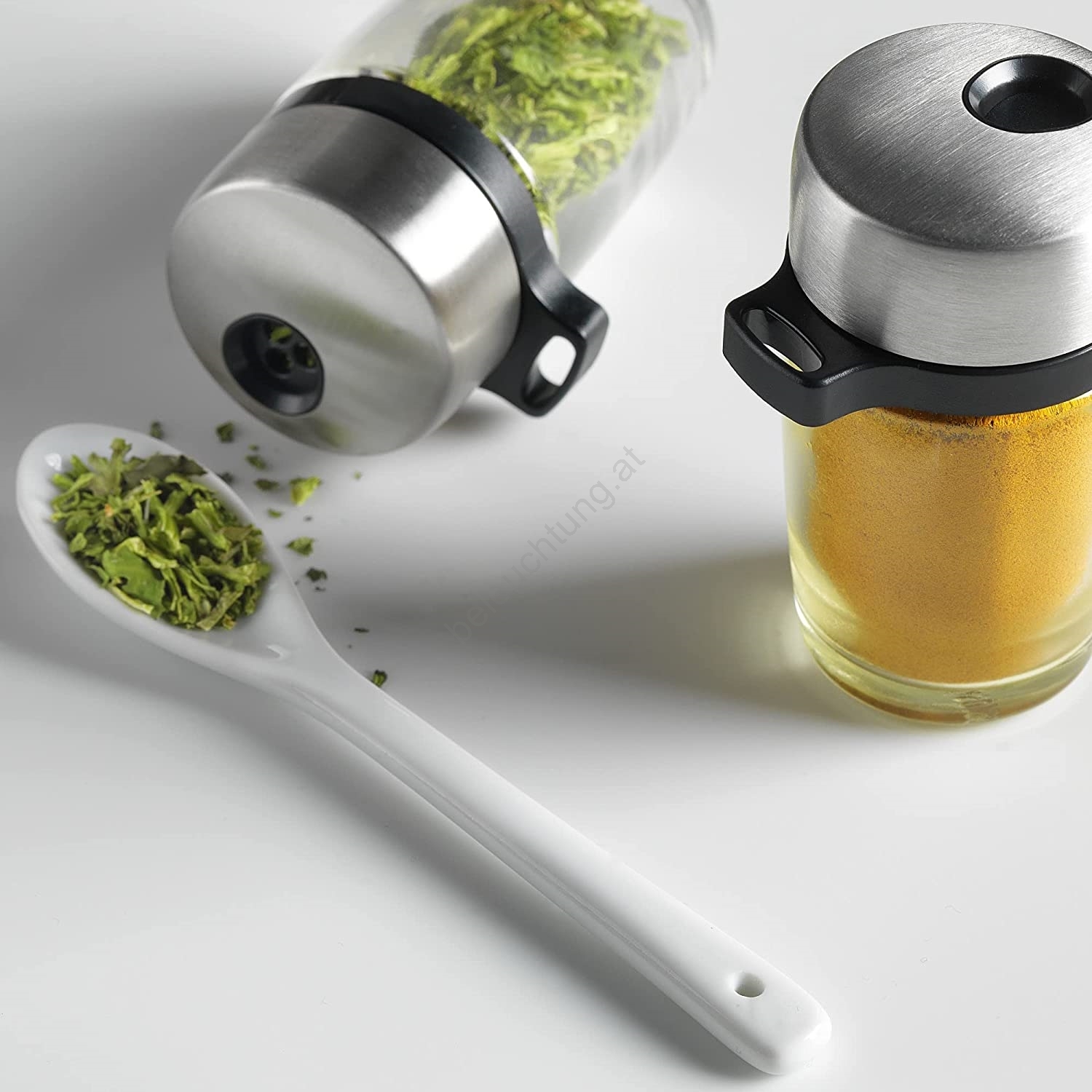 • Die Deckel dosieren präzise größere oder kleinere Mengen Gewürz, je nach gewähltem Loch, und ermöglichen so die Zubereitung perfekt gewürzter Gerichte in wenigen Minuten.