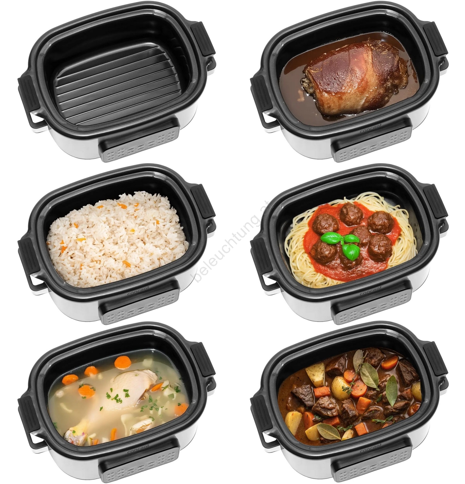 • 10 Programme: Schongaren bei niedriger und hoher Temperatur, Anbraten, Backen, Aufwärmen, Schmoren, Reis, Getreide/Hülsenfrüchte, Joghurt, Dampf + manueller Modus.