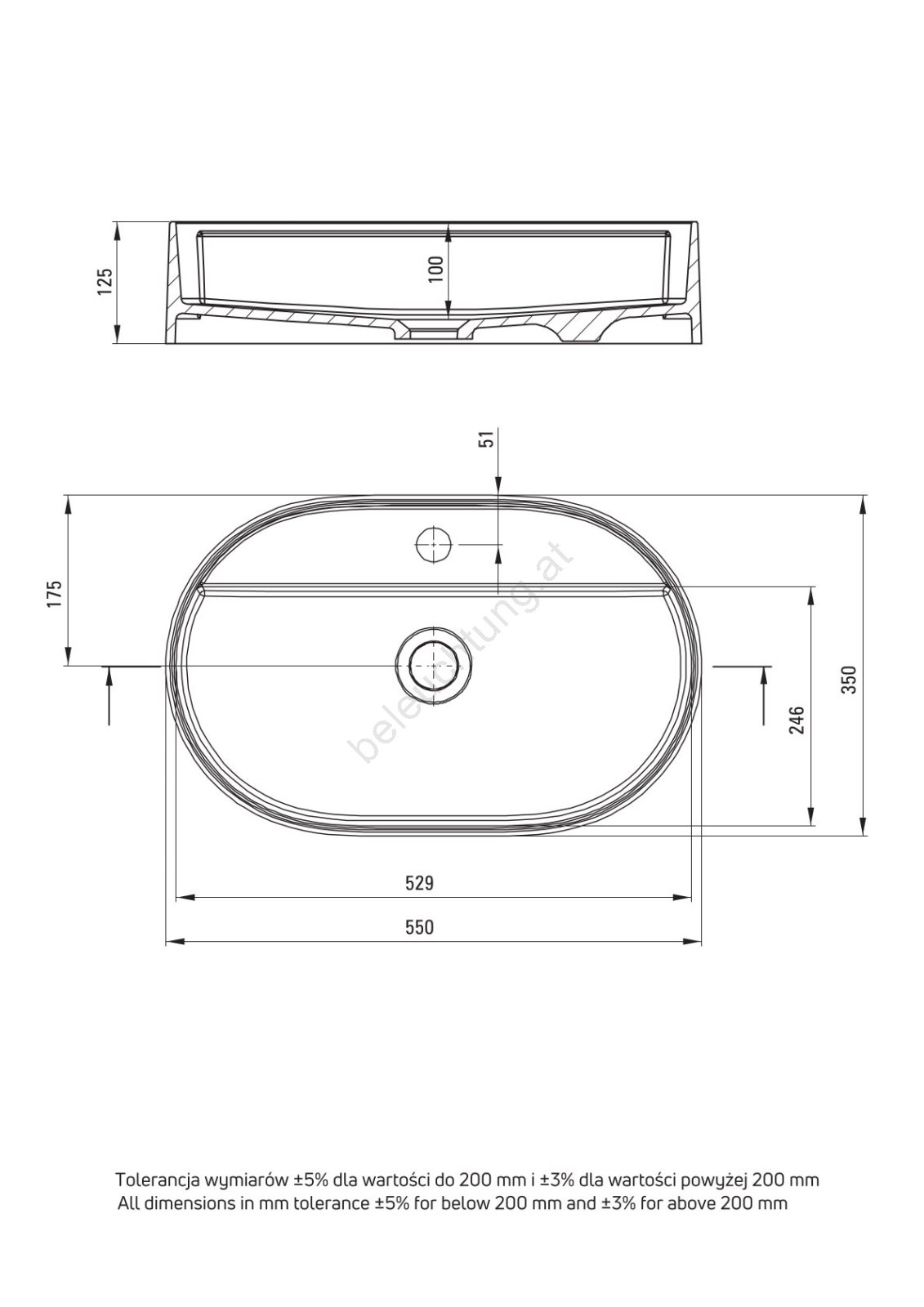 • Das Waschbecken ist zur Montage auf der Arbeitsplatte vorgesehen, was eine flexible Platzierung und Kombination mit verschiedenen Arten von Badarbeitsplatten ermöglicht.