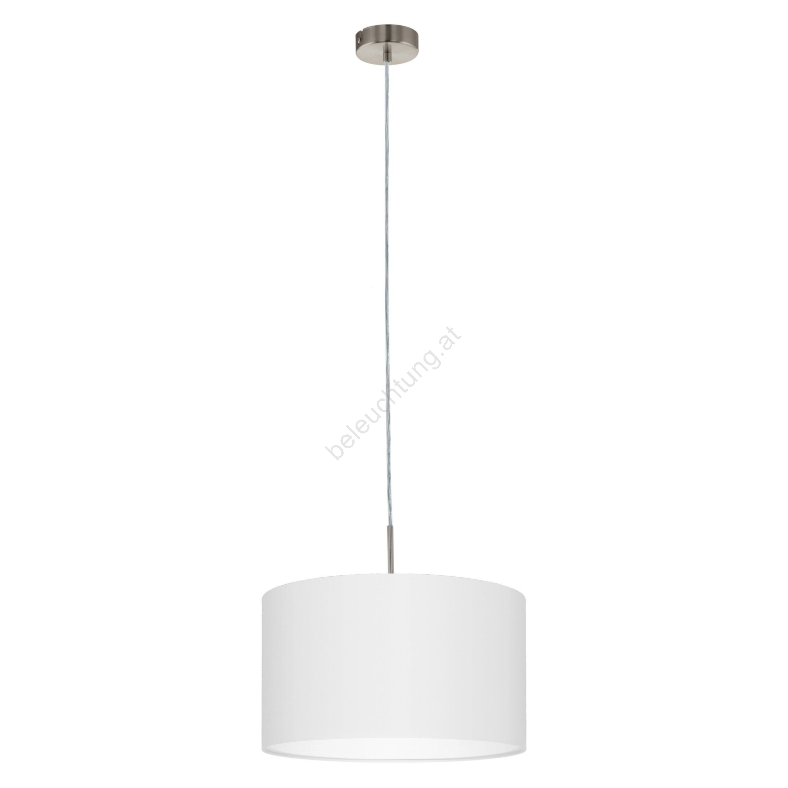 • Das Erscheinungsbild der Leuchte wird durch einen Lampenschirm aus weißem Textil unterstrichen, ergänzt durch einen Metallpendel.