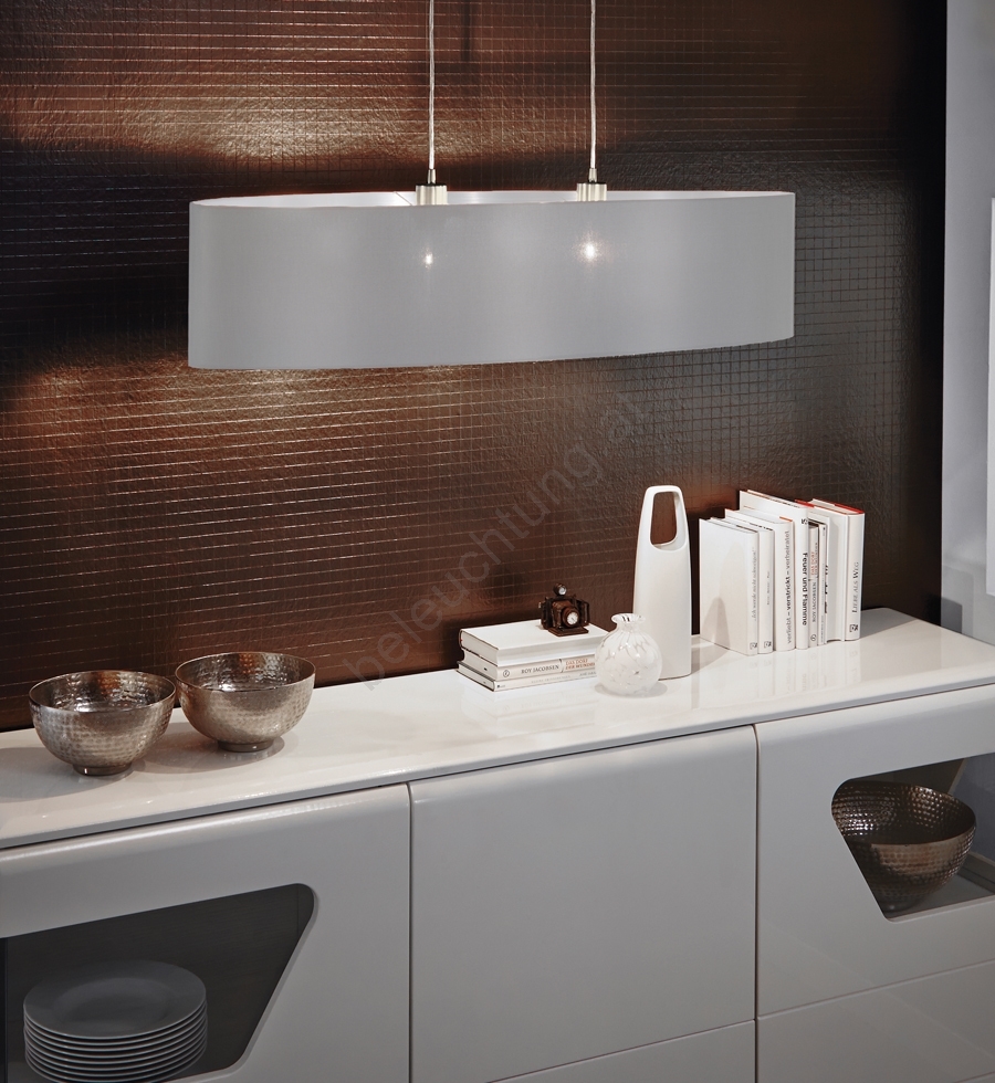• Das Erscheinungsbild der Leuchte wird durch einen ovalen Lampenschirm aus grauem Textil unterstrichen, ergänzt durch einen Metallpendel.
