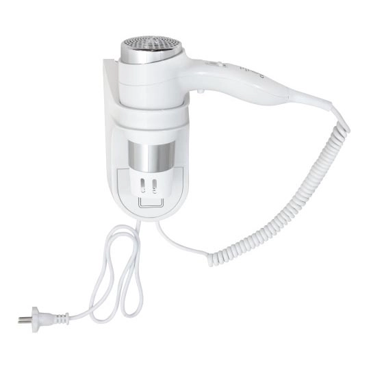 • Eleganter weißer Föhn mit Wandhalter zur platzsparenden Montage.