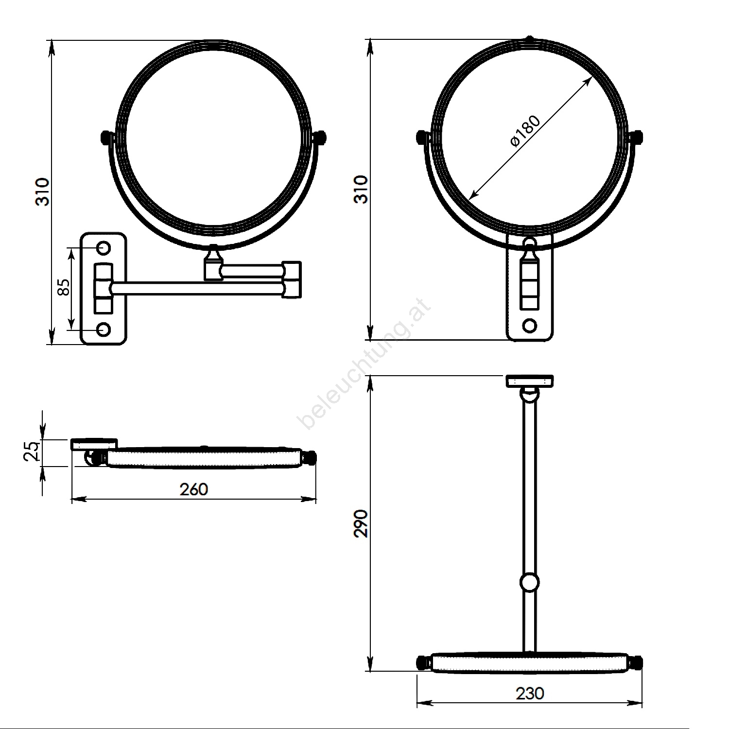 • Der Durchmesser des Spiegels beträgt 18 cm.