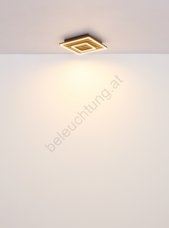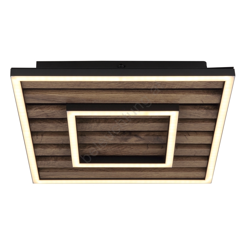 • Quadratische Form mit schwarzem Rahmen, ergänzt durch eine MDF-Platte mit dunkler Holzoptik und einem opalweißen Kunststoffschirm.