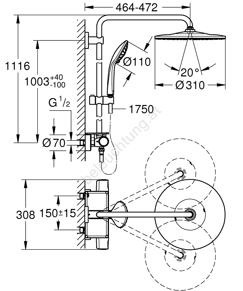 • Horizontal schwenkbarer Duscharm, 450 mm lang, für flexible Ausrichtung.