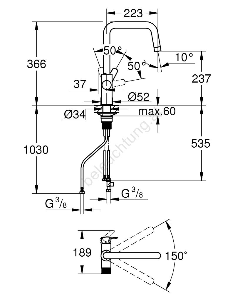 • Schwenkbarer Rohrauslauf mit 150° Schwenkbereich erleichtert das Befüllen und Reinigen größerer Gefäße.