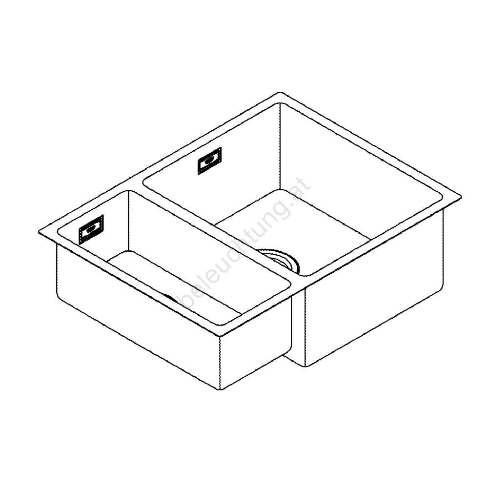 • Gesamtmaße der Spüle 595 x 450 mm, Hauptbecken 340 x 400 x 200 mm, Nebenbecken 180 x 400 x 140 mm.