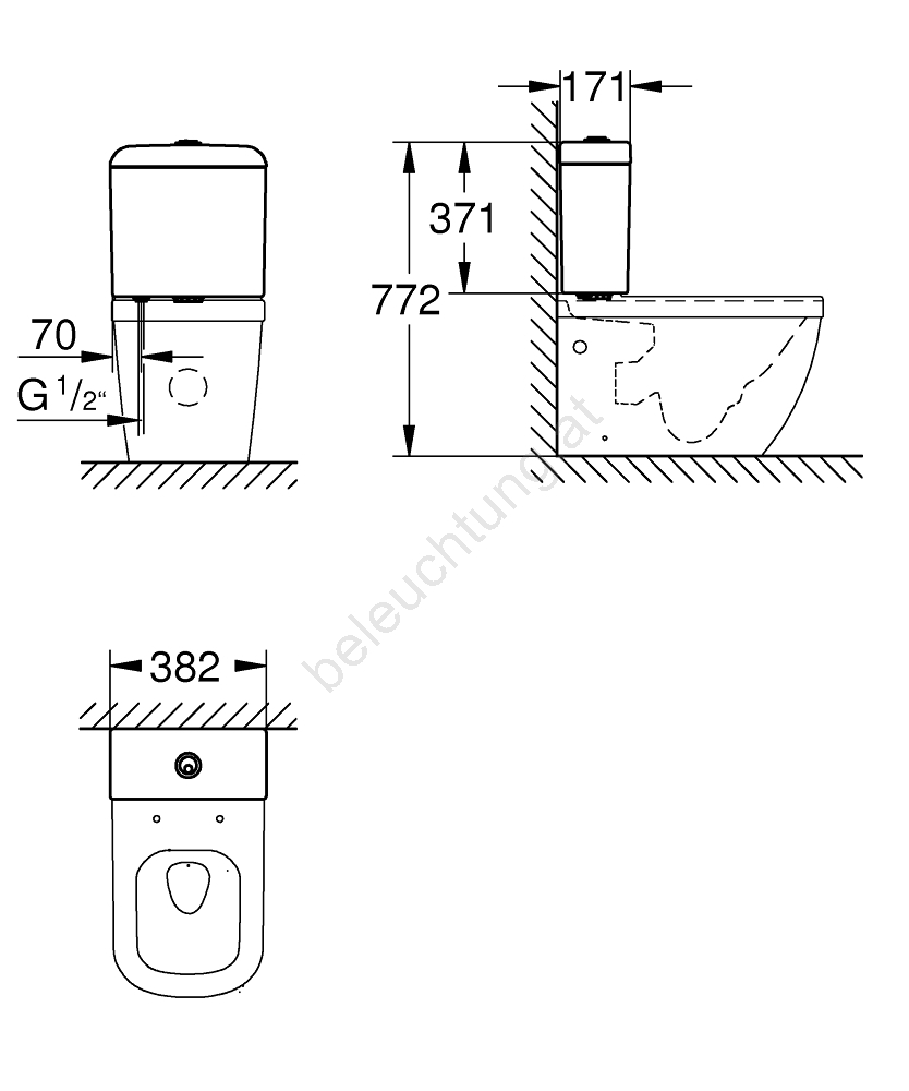 • Maße des Spülkastens: 385 × 170 × 370 mm.