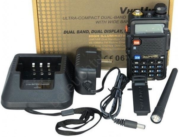 • Das Paket enthält: 1x UV-5R 5W (VHF 136-174, UHF 400-520Mhz), 1x 7,4V 1800 mAh Li-Ion-Batterie, 1x Dual-Band-Antenne – neues flexibles Modell, 1x Tischladegerät, 1x Hands-Free-Kit, 1x Gürtel-Clip, englischsprachige Anleitung.