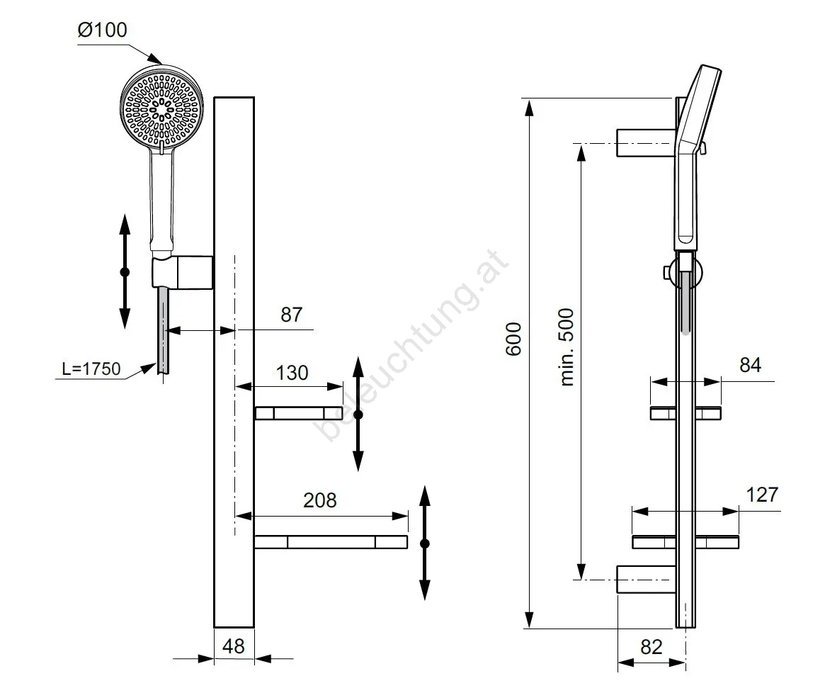 • Die Duschstange hat eine Gesamtlänge von 600 mm und einen minimalen Befestigungsabstand von 500 mm.