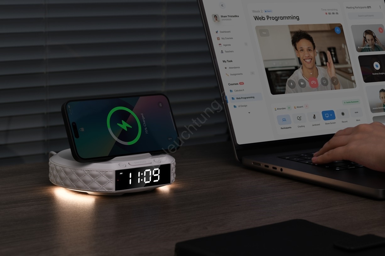 • Stilvolle Tischuhr und Ablage-Ladestation für Ihre Smart-Geräte.