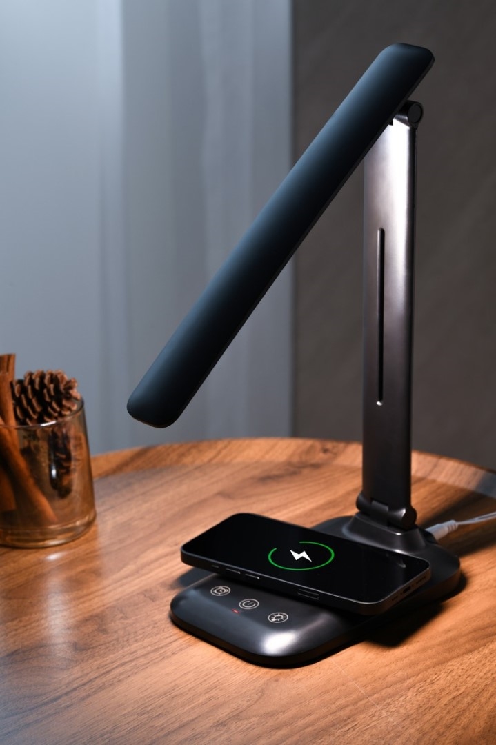Dimmbare LED-Schreibtischlampe mit kabelloser Qi-Ladefunktion und USB — LUMI LED/7W/230V, schwarz