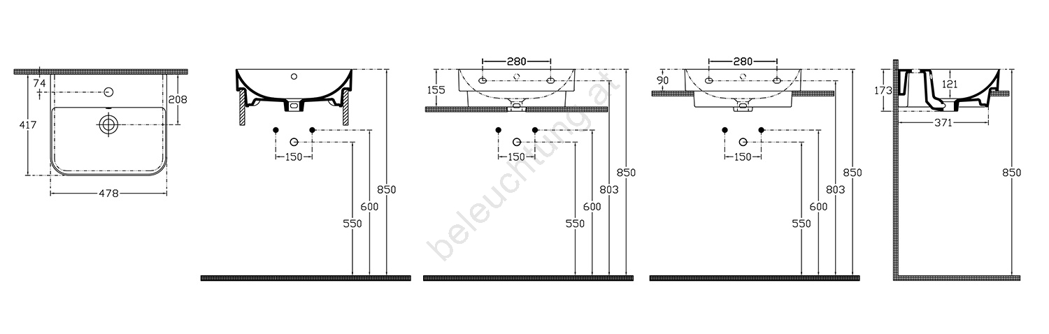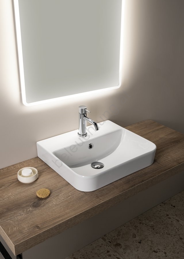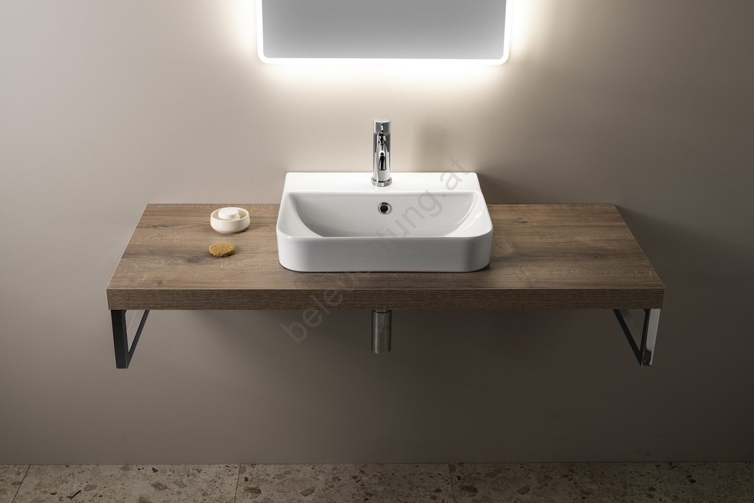 • Es kann an der Wand aufgehängt, auf einer Waschtischplatte aufgestellt oder in diese eingelassen werden.