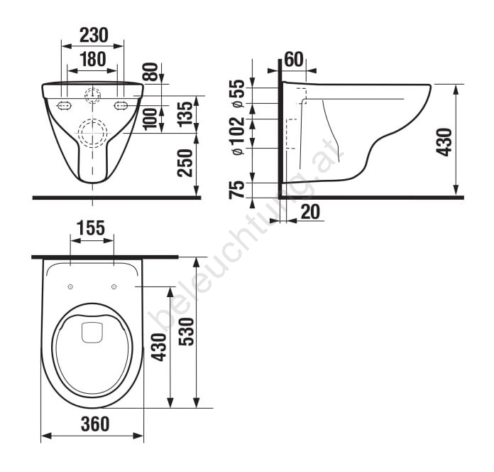 • Wandhängendes WC ohne traditionellen Spülrand.