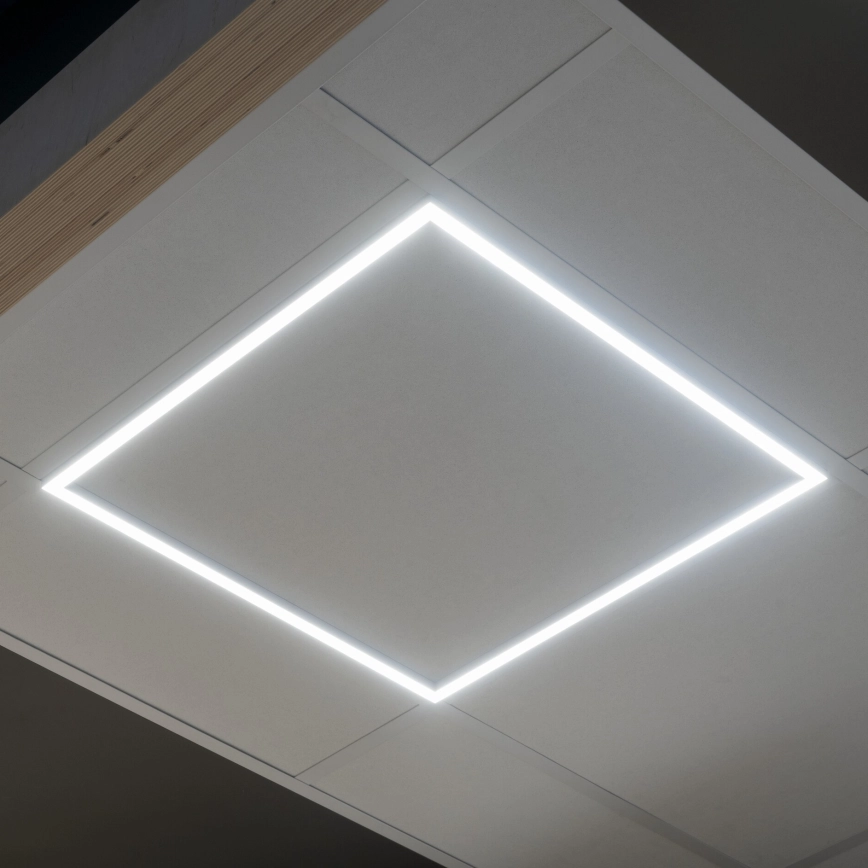 • Im Gegensatz zu herkömmlichen LED-Panels leuchtet er nur am Rand und verleiht so jedem Rasterdeckenfeld eine dezente, elegante Note.
