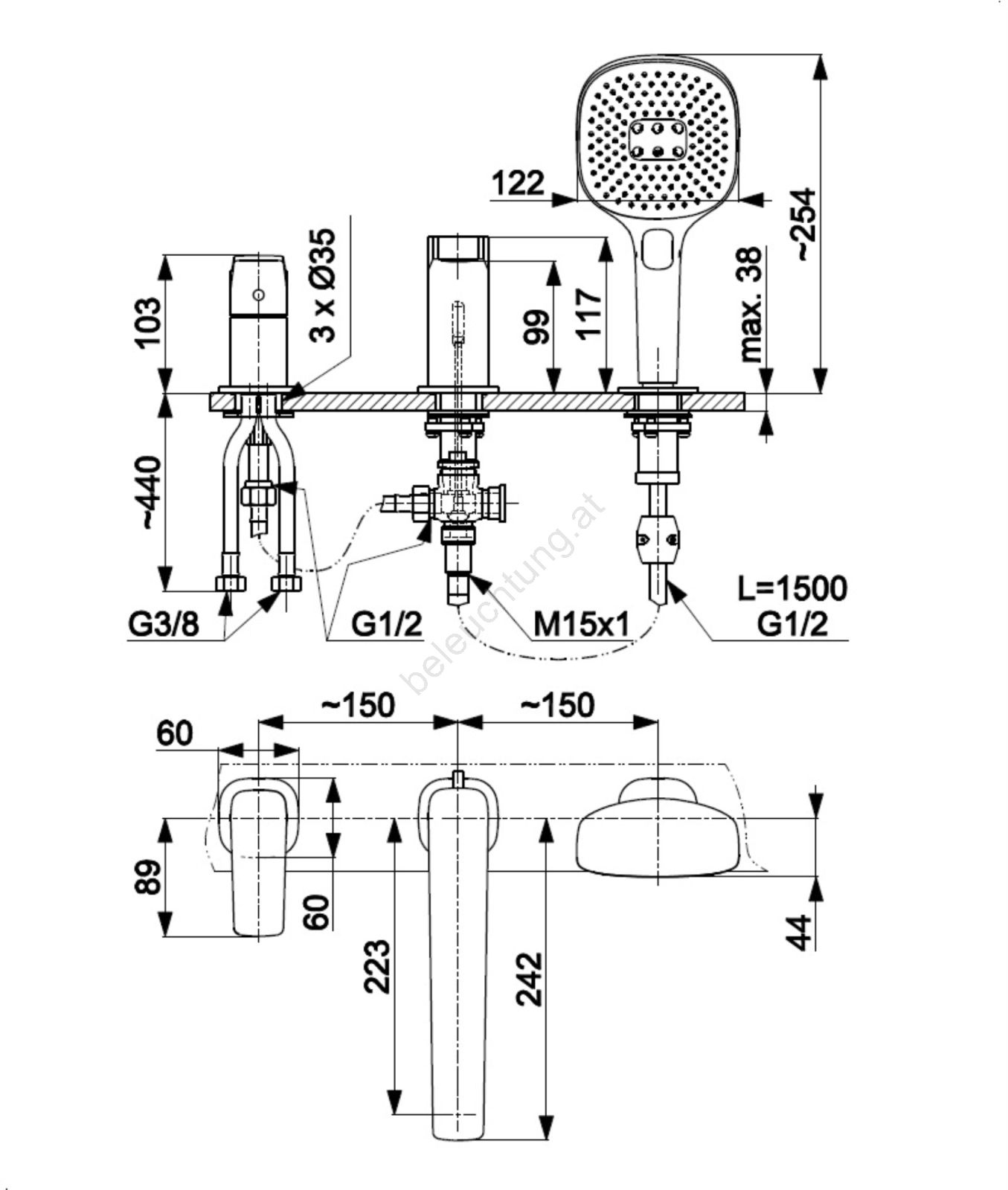 • Lieferumfang: Auslauf, Duschhandstück, Reglergehäuse, Duschschlauch (L=1500 mm) mit Dichtung, Schlauchdurchführung, Satz flexibler Anschlüsse.