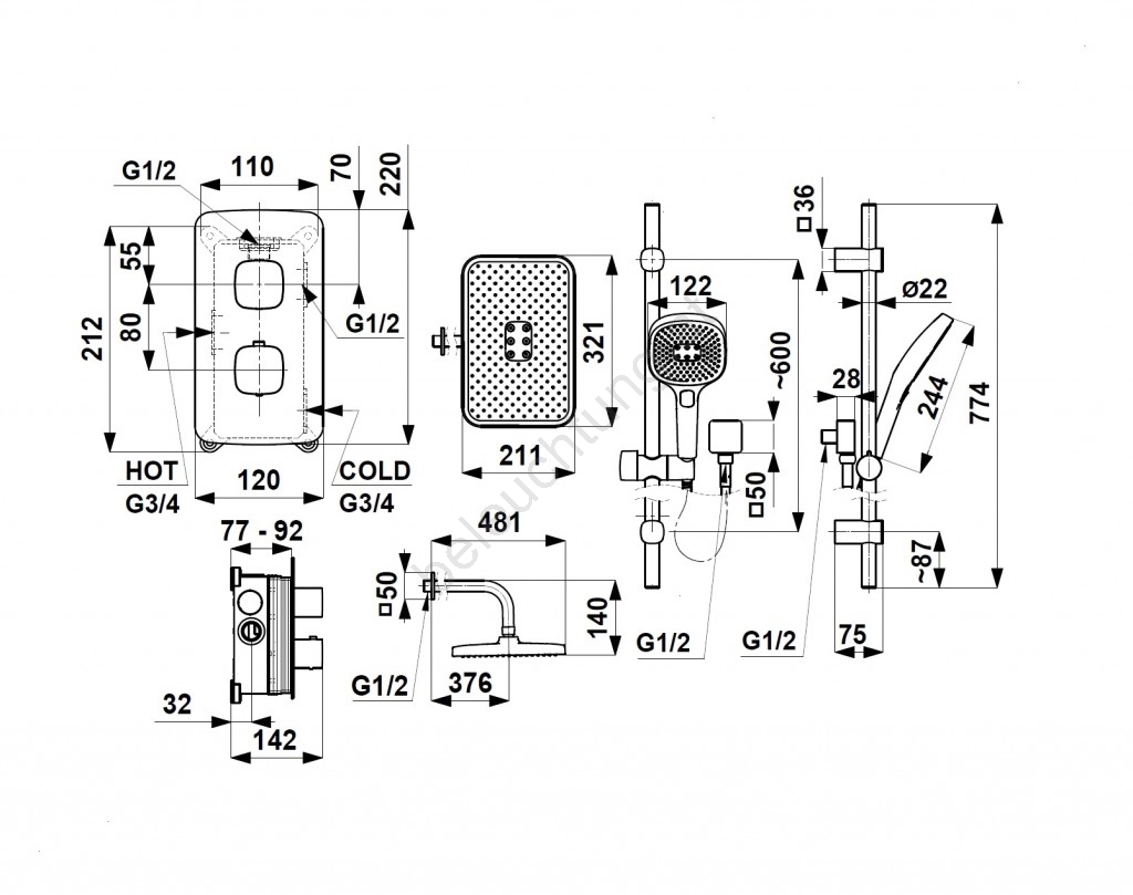 • Lieferumfang: Unterputzbox, komplette Armatur, Duscharm, Duschkopf mit Schlauch, verdeckte Handbrause mit Gleitschiene.