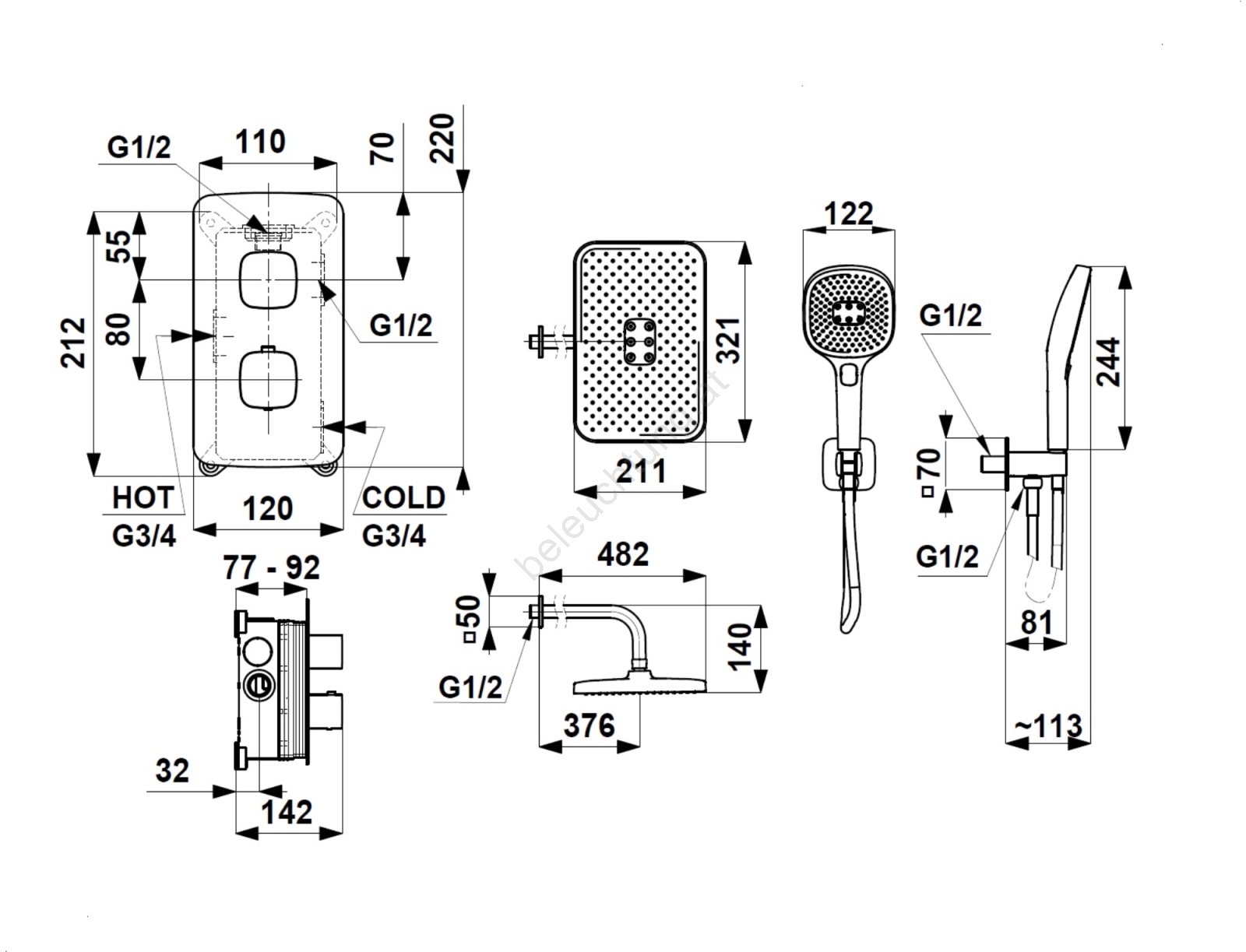 • Lieferumfang: Unterputzbox, komplette Armatur, Duscharm, Duschkopf mit Schlauch, Unterputz-Wand-Eckanschluss.