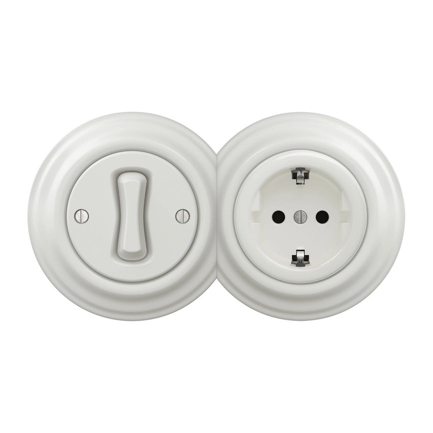 Kliklap – Retro-Einpolschalter Nr. 1 und SCHUKO-Steckdose 230 V mit Rahmen, keramikweiß