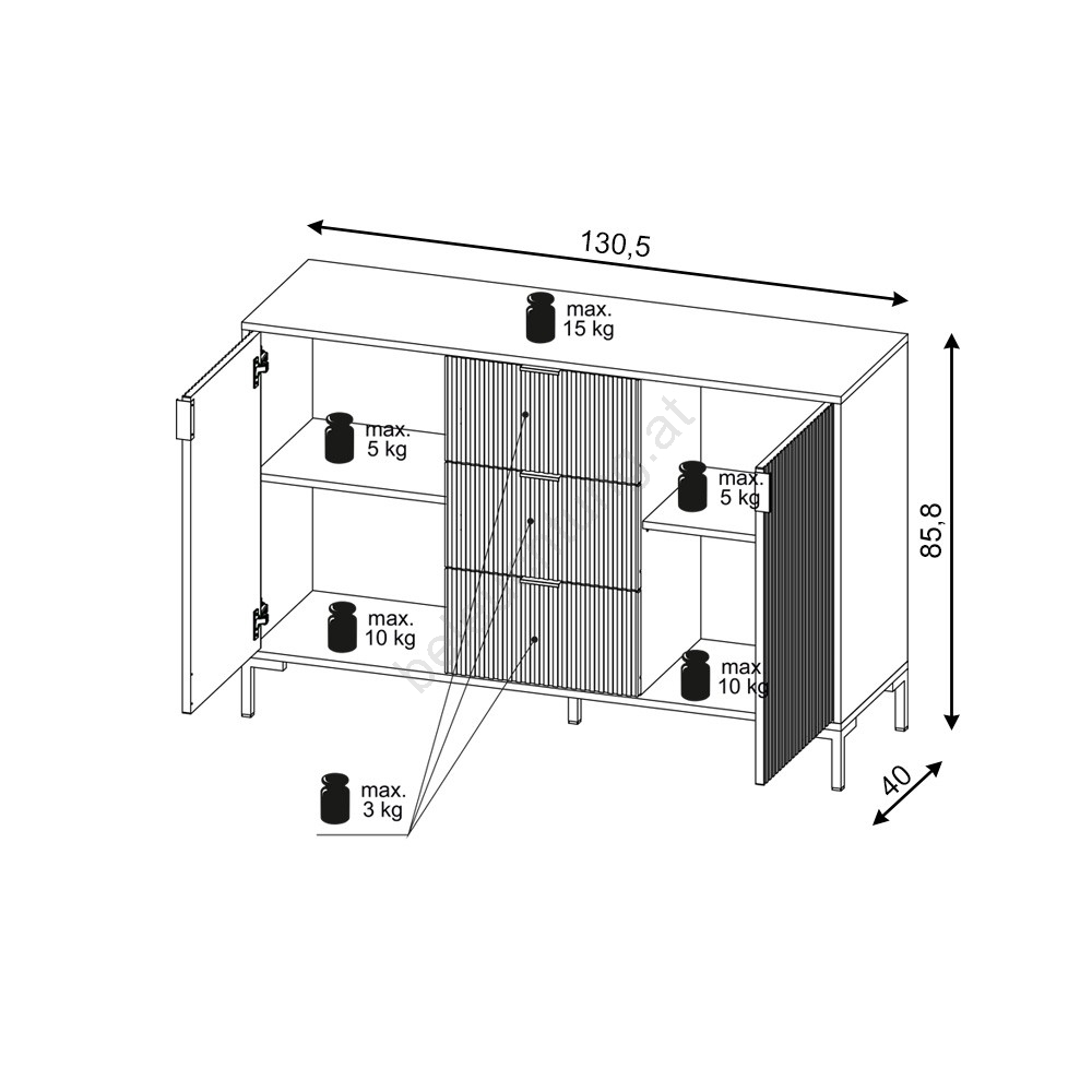 • Sie verfügt über vier Regalböden, zwei Türen und drei Schubladen mit vertikaler Riffelung.