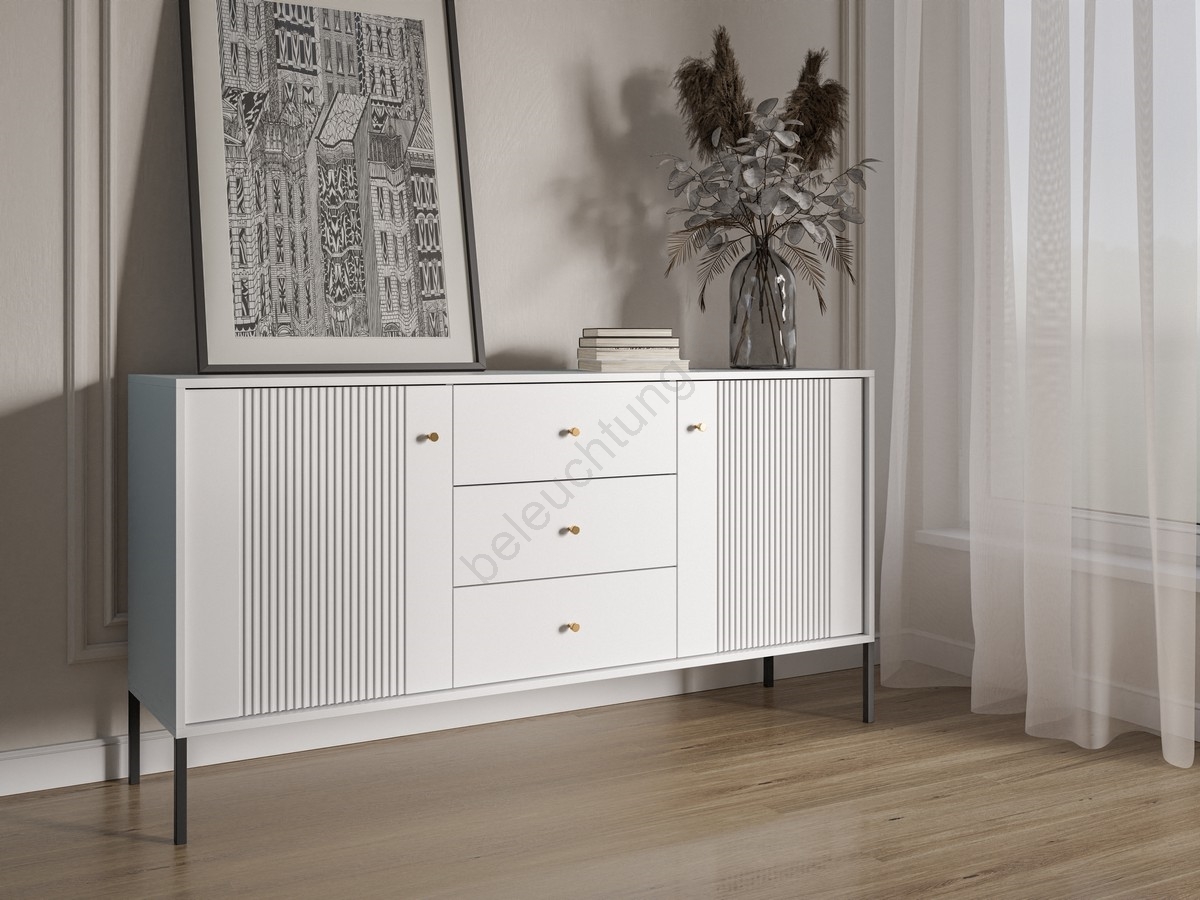 • Sie verfügt über drei mittige Schubladen sowie zwei Fächer mit Türen und vertikal geriffelter Front.