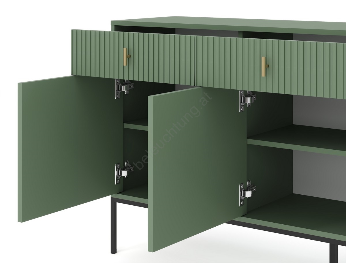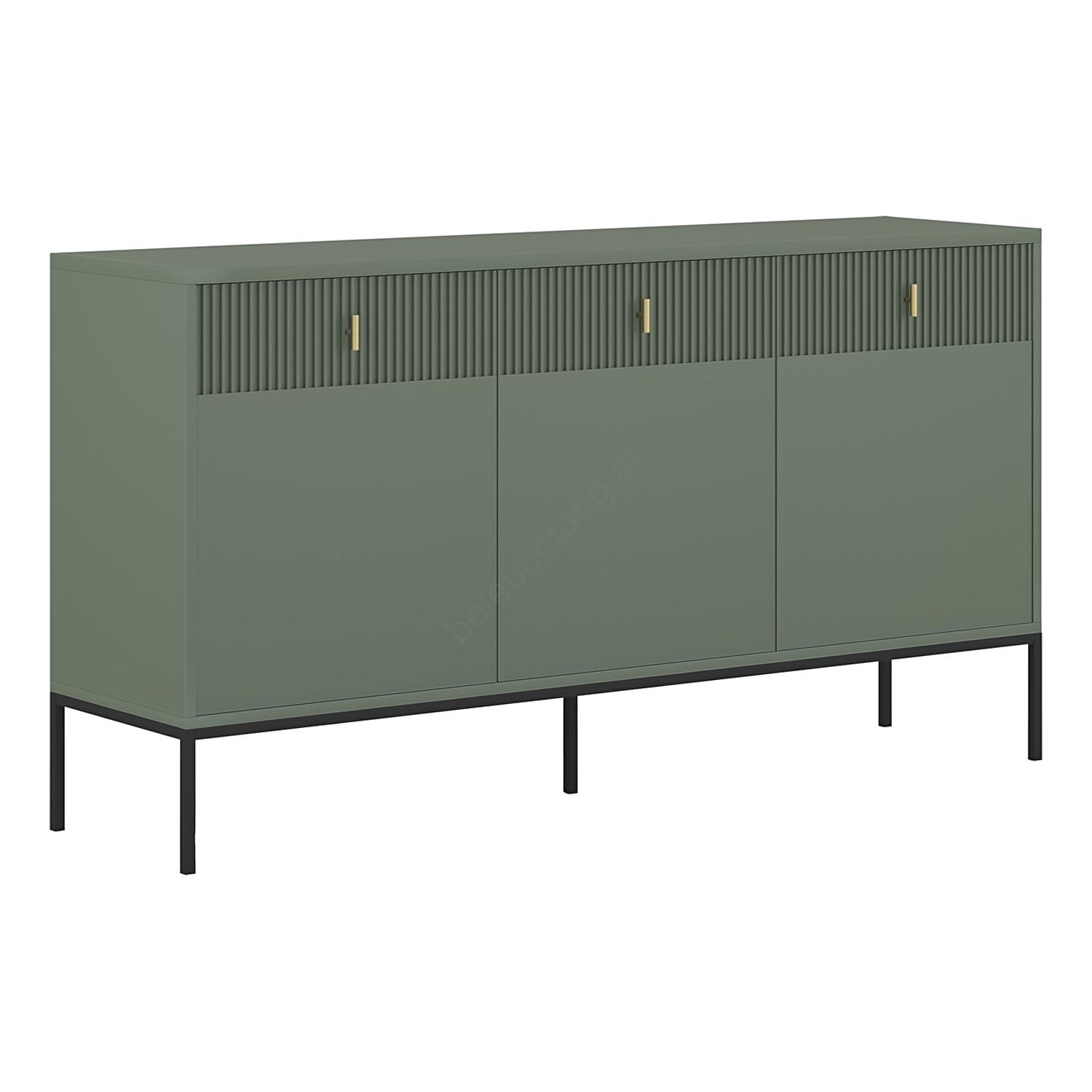 • Sie verfügt über drei untere Türen mit großem Stauraum sowie drei Schubladen mit Griffen und vertikaler Riffelung.