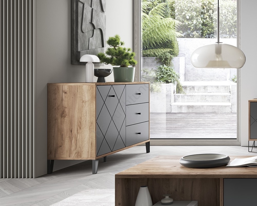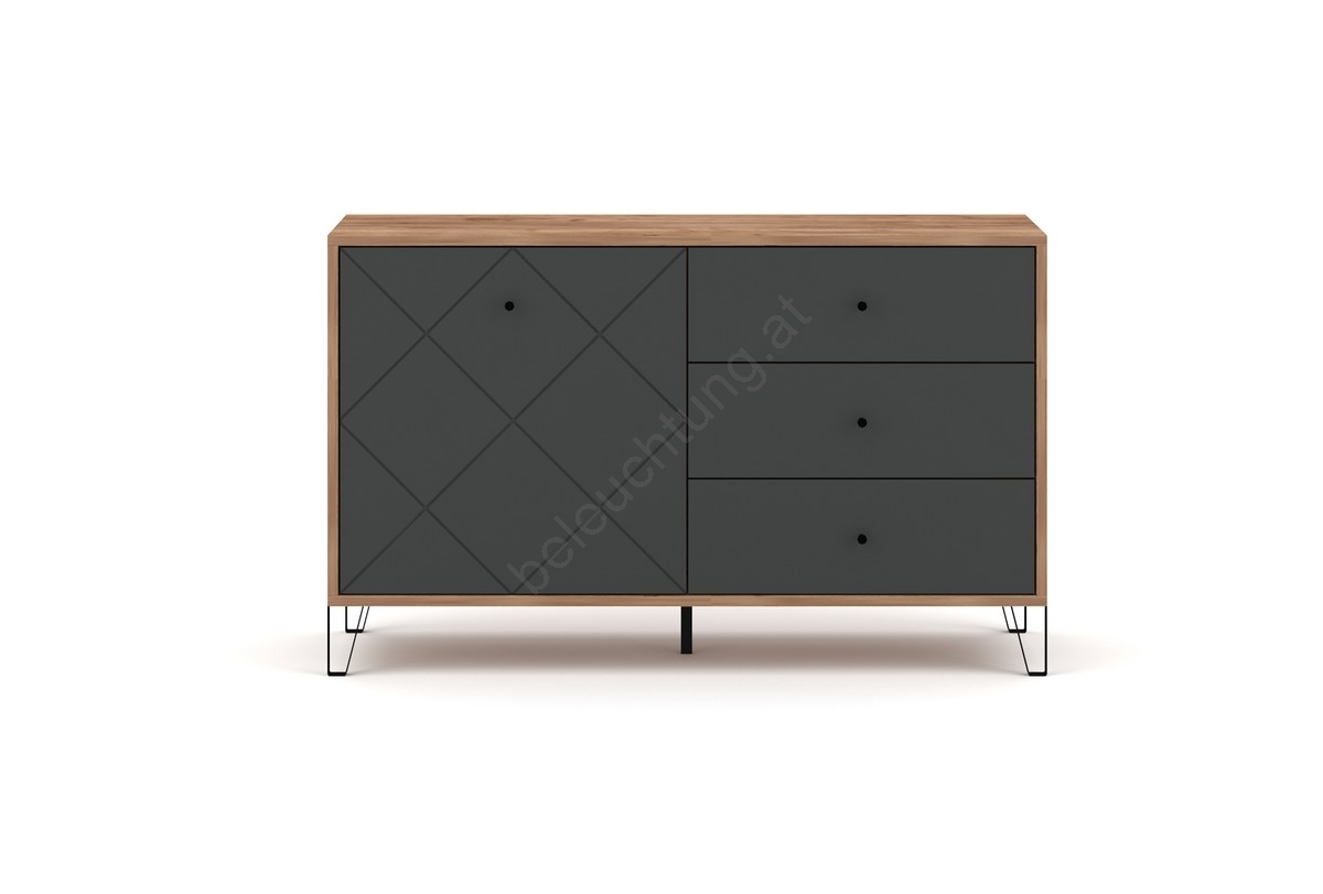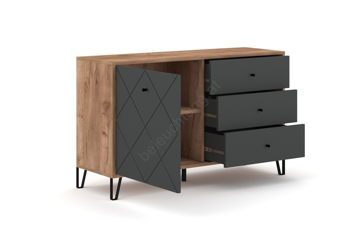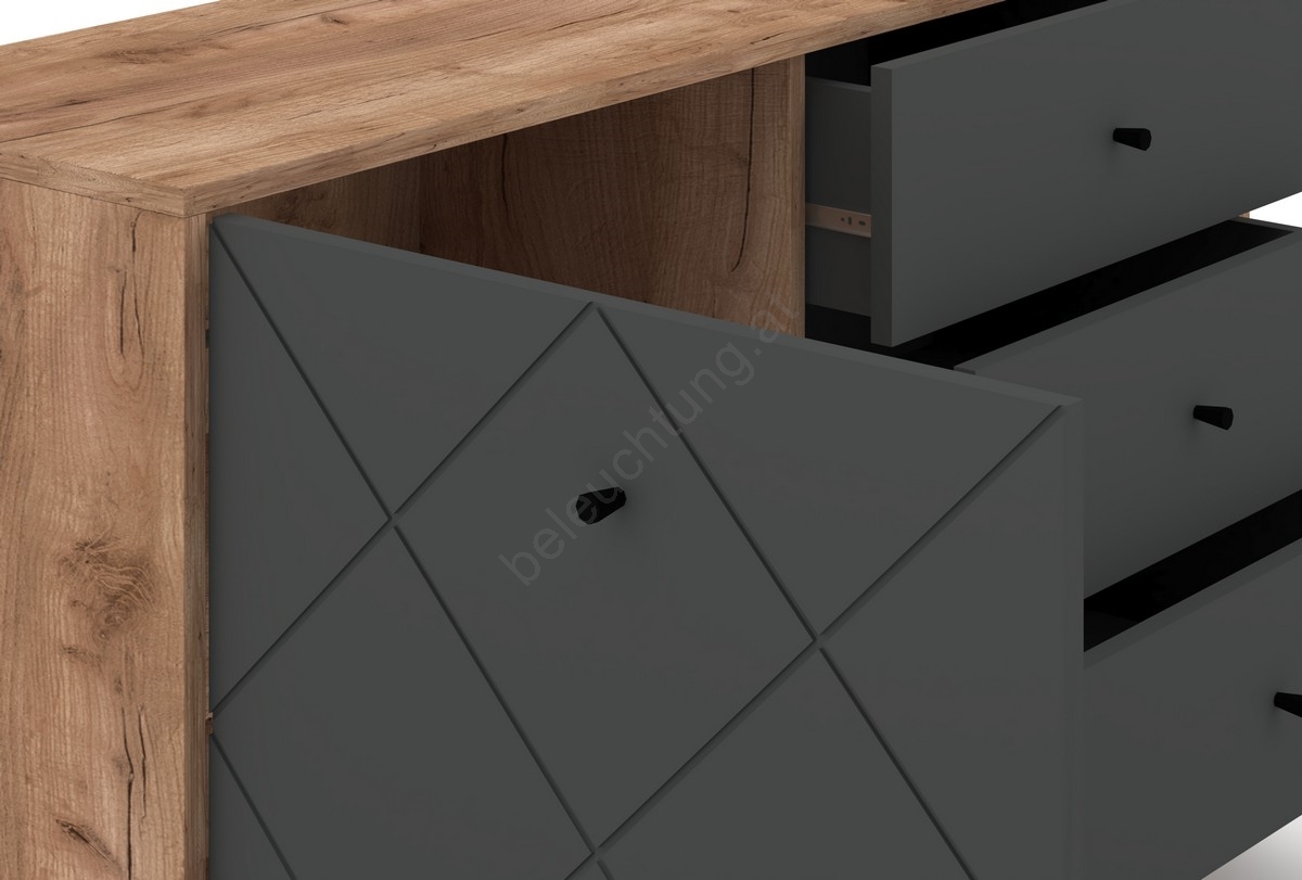 • Sie verfügt über eine Tür auf der linken Seite und drei Schubladen auf der rechten Seite – ideal für übersichtliche Aufbewahrung.