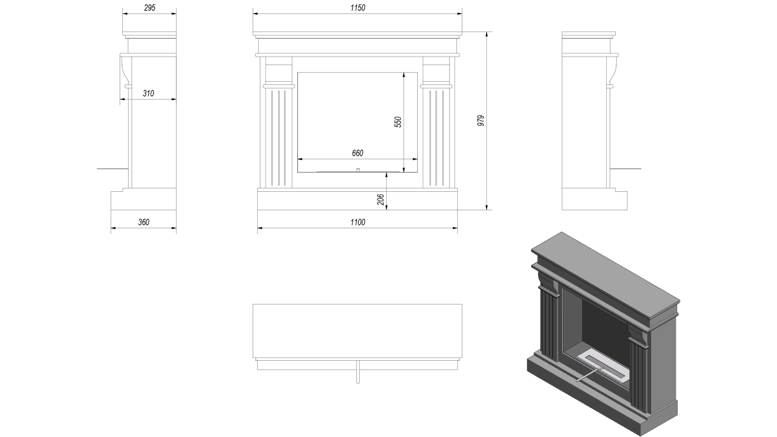 • Abmessungen des Kamins: 97,9 x 115 x 36 cm.
