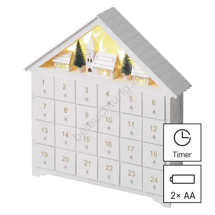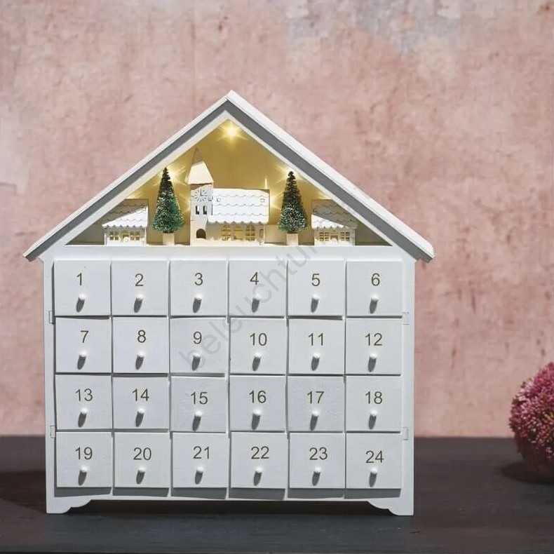 • LED-Adventskalender in Form eines Häuschens.
