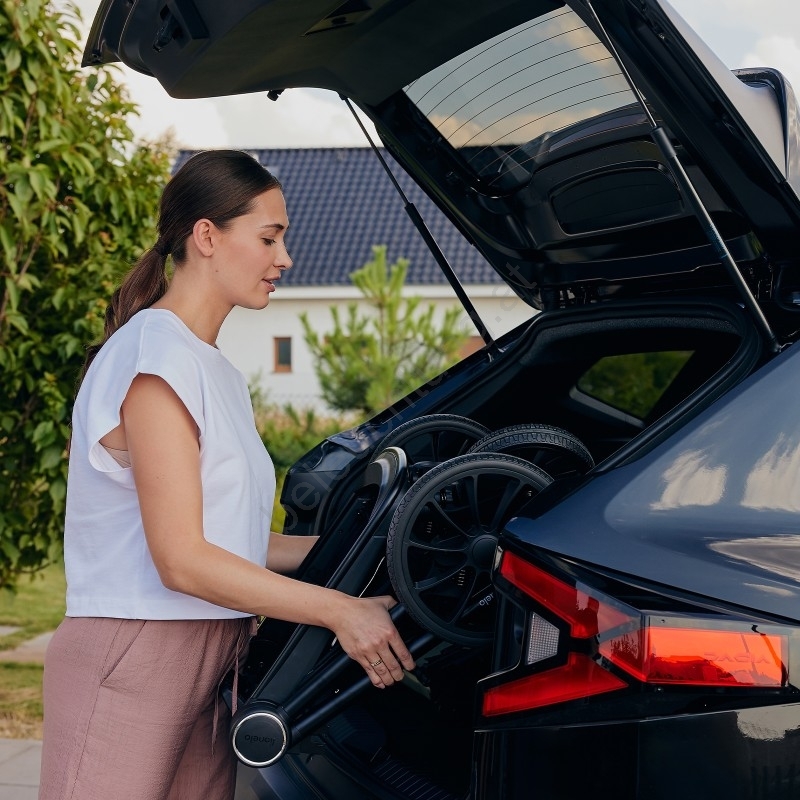 • Babywanne mit 3° Neigung gegen die Fahrtrichtung zur Refluxprävention, Memory-Adapter, Innen- und Außentasche, flach zusammenklappbar.