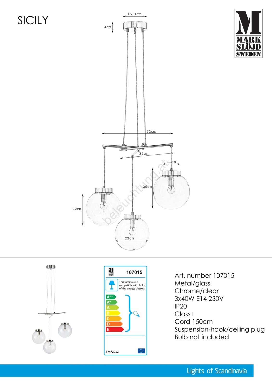 Markslöjd 107015 - Kronleuchter an einer Litze SICILY 3xE14/40W/230V zeichnet sich durch schönes und funktionales Design aus. Eine Glühbirne mit E14 Sockel ist für die Leuchte geeignet. Hier, können Sie andere Glühlampen zu vorteilhaften Preisen kaufen. Sie erhalten eine attraktive Ergänzung für Ihr Zuhause.