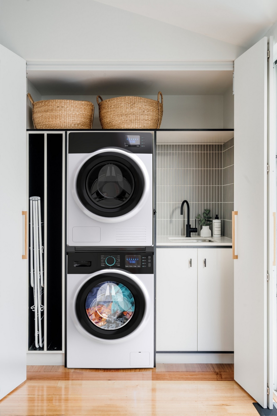 • Universeller Verbindungssatz für Waschmaschinen mit einer Tiefe von 45–70 cm und Frontlader‑Trockner.