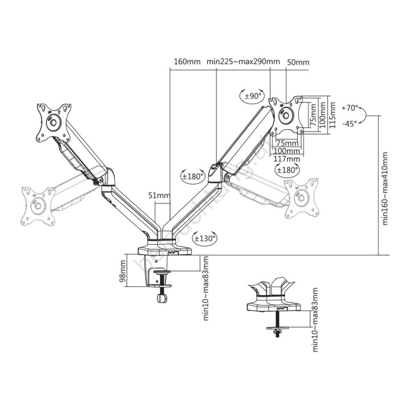 • Nach der Montage am Tisch sind seitliches Schwenken, horizontale und vertikale Drehung des Bildschirms, Neigung in verschiedenen Winkeln sowie Höhenverstellung möglich.